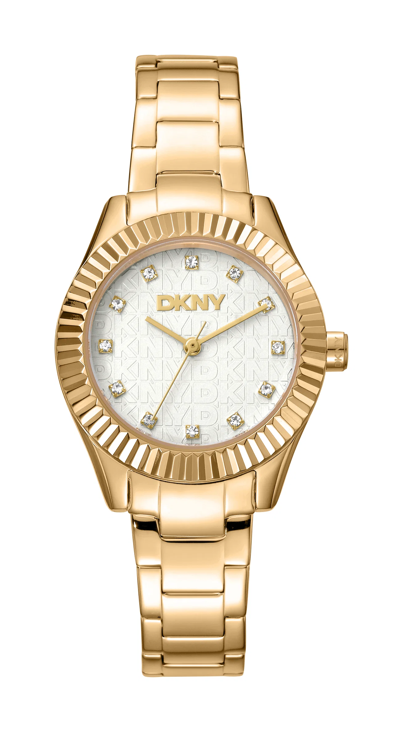Elegant dameur fra DKNY med sølvfarvet skive og eksklusiv guldfarvet lænke. Det klassiske 30 mm design giver et feminint og stilrent udtryk, der passer til både hverdag og fest.